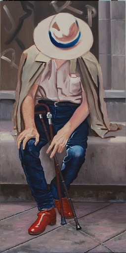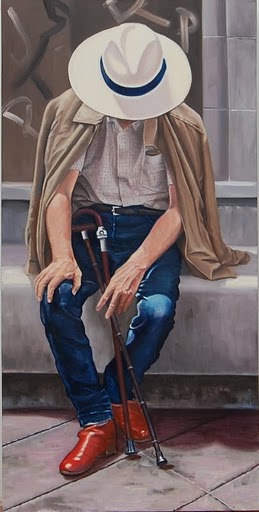 Había tres cosas que quise resaltar y que eran muy peculiares suyas, el sombrero, las botas y la quietud o meditación que me transmitía. Por eso pensé en pintar todo el fondo con grises utilizando tierras, azules y carmines, unas veces más azul, otras más violeta, para que solo destacase su presencia y la luz, la luz es muy importante. Quizá abuso un poco de la luz en mis cuadros, pero necesito que esté presente, aunque solo sea un simple rayo de sol.