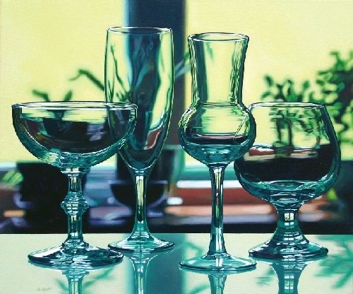 Nacido en Montreal, Jason de Graaf, vive en la actualidad en Oka, Quebec, estudio ilustracion en la Dawson College, en Montreal, My paintings are about staging an alternate reality, the illusion of verisimilitude on the painted surface, filtered so that it expresses my unique vision. Though my paintings may appear photoreal my goal is not to reproduce or document faithfully what I see one hundred percent, but also to create the illusion of depth and sense of presence not found in photographs. Many of my paintings are about the relationship of light with reflective and transparent surfaces and my journey to understand those qualities and convey my sense of wonder and intrigue over them. In all of my paintings the subject matter is a springboard and a means to explore my ability to communicate something unique to the viewer. I use colours and composition intuitively with the intent of imbuing my paintings with emotion, mood and mystery. Throughout, I try to remain open to new ideas as the painting unfolds.