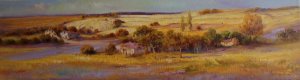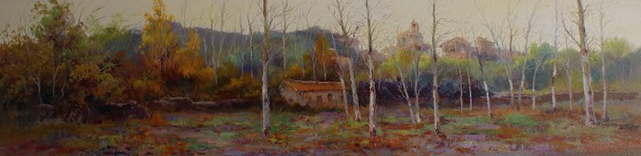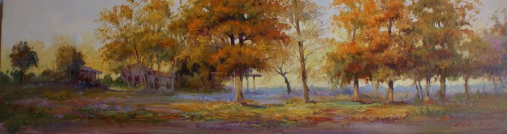 Compre un pequeño oleo de un pescador de truchas en pleno rio, la corriente, el pedregal y el pescador de espaldas,con su cesta y su sombrero , me encanta.