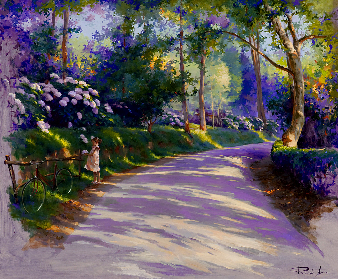 El Ricardo Sanz de los 80 y 90, el pintor que se instala en Madrid, se nutre de los clásicos (Velázquez, Van Dyck o Rembrandt), y toda la pintura del XIX y la Escuela Española. Al mismo tiempo, conoce a los grandes pintores figurativos y retratistas del momento como Macarrón, Torrents Lladó, Antonio López o Revello de Toro, lo que le sirvió para enriquecer su espíritu artístico y sus conocimientos al más alto nivel de la pintura figurativa. Su paleta se hace más fuerte y colorista; Su obra madura con un aire moderno y renovador, mezclando una composición exquisita, con una técnica depurada y un especial dominio del color y la luz, imprimiendo una pincelada moderna y original que consigue reflejar con especial maestría los efectos de la luz, que se convierte en protagonista de sus cuadros.