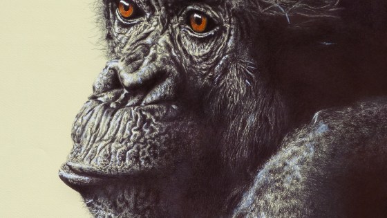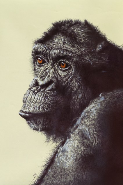 AUTOR: KILE ZABALA TÍTULO: MONO TÉCNICA: BOLÍGRAO BIC NEGRO SOBRE PAPEL AMARILLO, LÁPIZ NARANJA EN LOS OJOS, ACUARELA BLANCA EN REFLEJOS