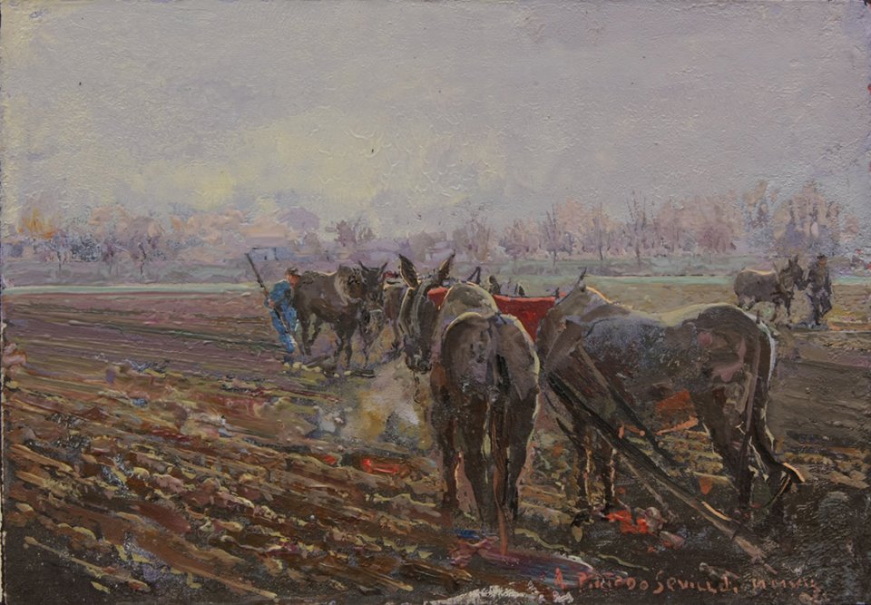 CAPRICHOS. Arando con mulas. Óleo-tela-madera. 12x18cm