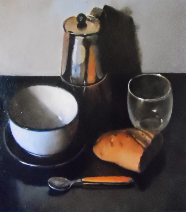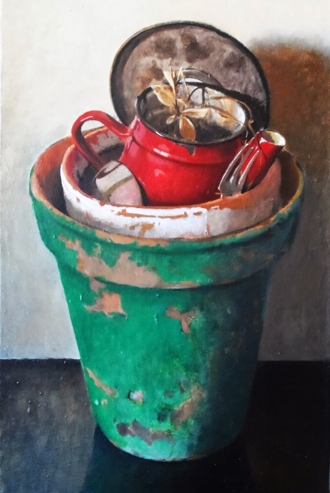 Macetas y tetera roja, Oleo sobre tela entelada 45×50